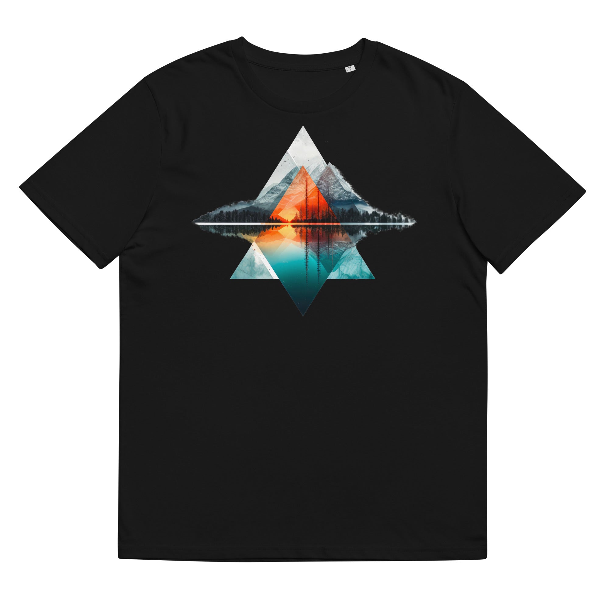 Unisex-Bio-Baumwoll-T-Shirt mit dem Aufdruck einer abstrakten Landschaft mit geometrischen Formen.