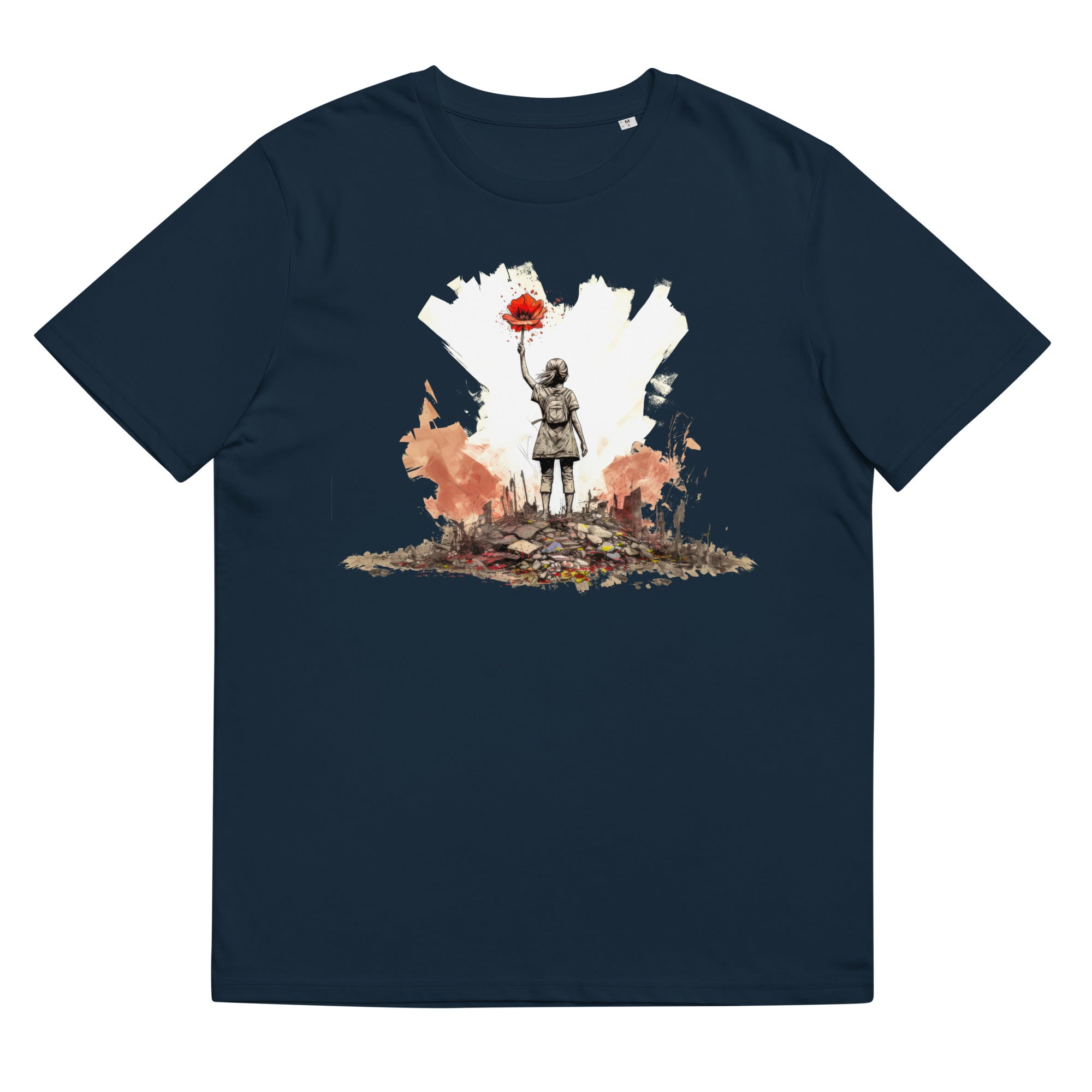 T-Shirt - Frontprint - Mädchen vor zerstörter Stadt mit Blume in der Hand